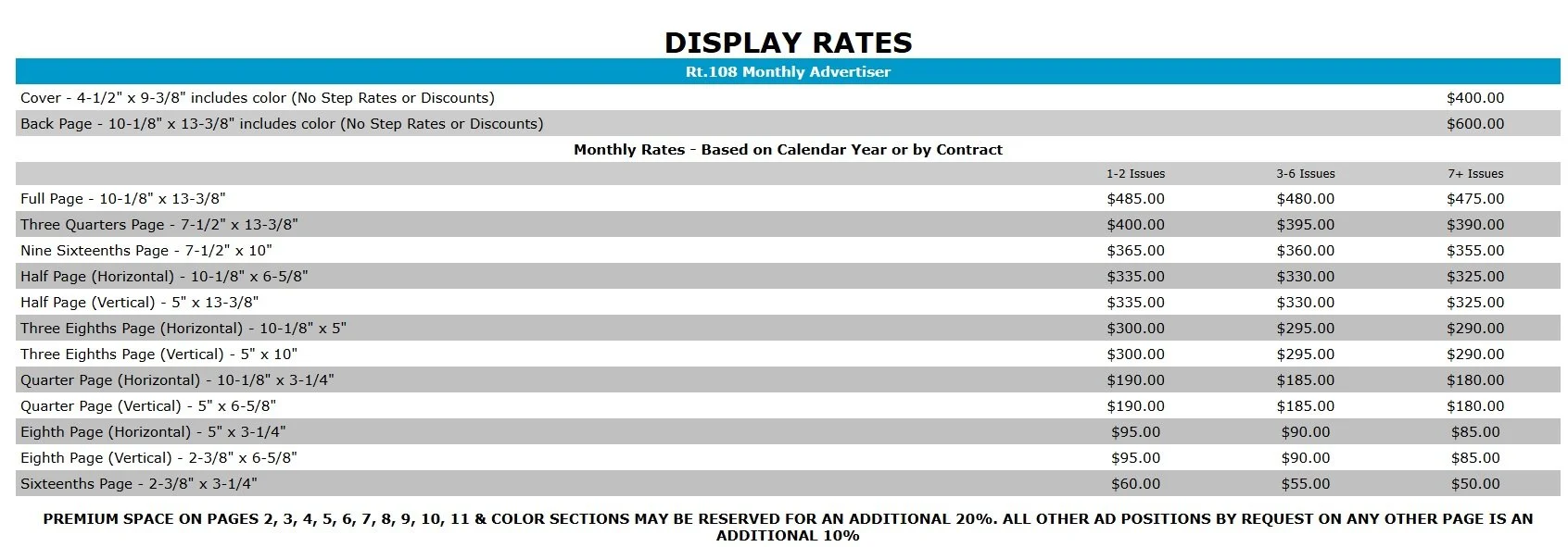 12,000 Direct Mail | 3,000+ additional available free in businesses throughout the Rt. 108 Corridor